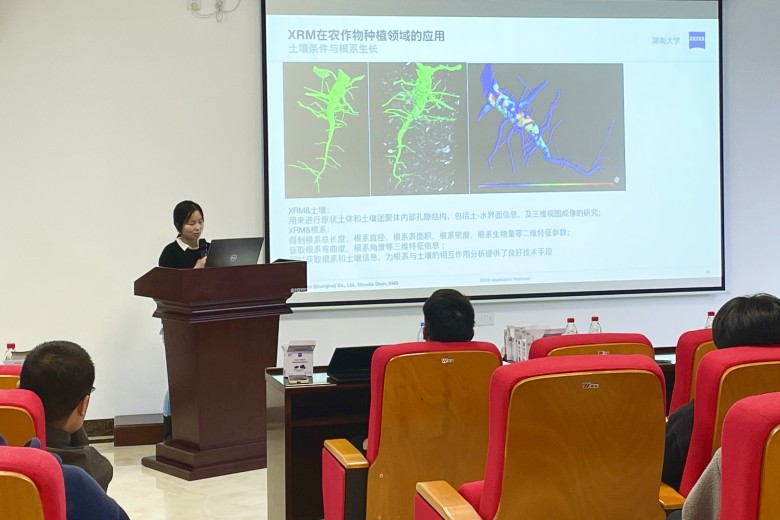 我校材料学院院长龙飞教授为此次研讨会做开场致辞。随后,蔡司应用专家分别做了主题为“扫描电镜+聚焦离子束多功能表征加工平台技术介绍”和“X射线显微成像技术典型应用”两场报告。现场师生纷纷提出显微表征中遇到的难题与工程师交流,工程师也一一为其解答。为增强研讨会效果,切实解决师生测试中遇到的难题,当天下午,高分辨三维X射线显微镜应用专家沈宝云在3116室为部分师生做了样品的三维X射线成像演示。
