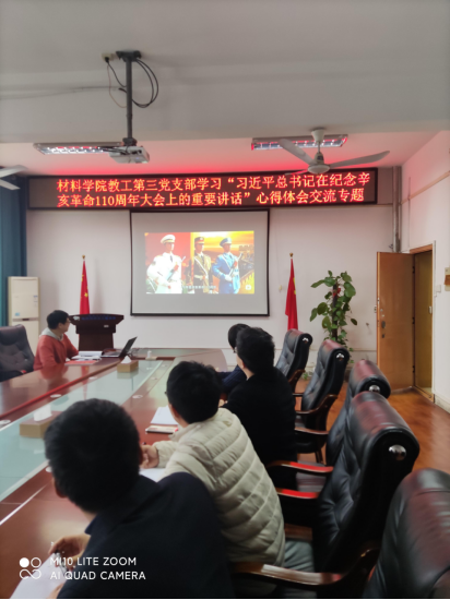 10月20日下午,材料科学与工程学院教工三支部在2308会议室召开组织生活会,主题为结合我院高分子材料与工程专业实际情况,开展习近平总书记在纪念辛亥革命110周年大会重要讲话专题学习,我院教工三支部全体教工党员均按时参加了此次学习。