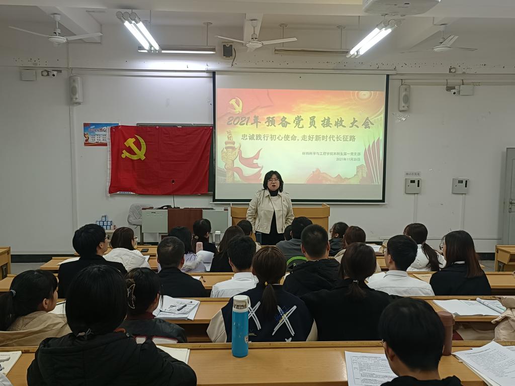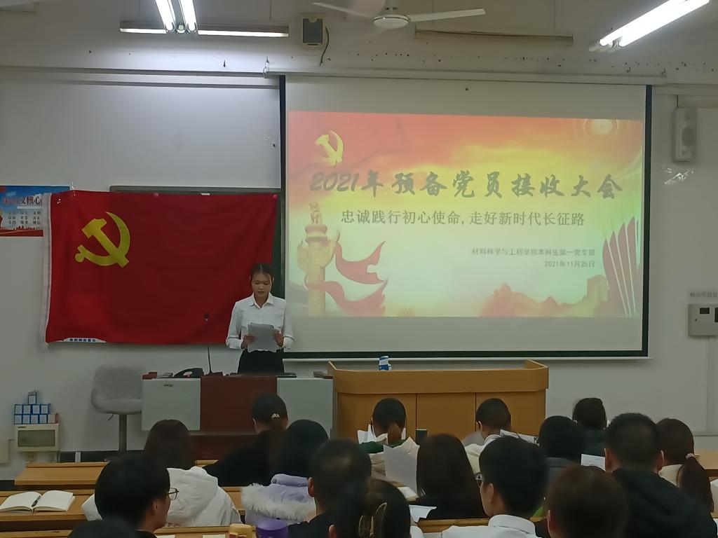 进一步健全和完善支部组织建设,增强支部生机与活力, 11月25日晚我院本科生第一党支部在屏风校区09511教室召开2021年秋季学期预备党员接收大会,本次会议主题为“忠诚践行初心使命,走好新时代长征路。”支部全体党员参加本次会议,会议由麦梅花同志主持。