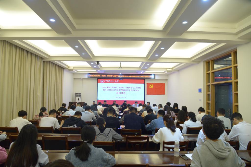 为深入学习贯彻习近平新时代中国特色社会主义思想和党的二十大精神。11月9日晚,土木与建筑工程学院、商学院、材料科学与工程学院联合分党校2022年秋季学期基层党支部书记培训在4204会议室正式开班。土木与建筑工程学院党委书记曾榕、材料科学与工程学院党委书记梁军、商学院党委书记白永生出席开班仪式,三个学院党委副书记、全体党支部书记参会以及师生党员代表参会。