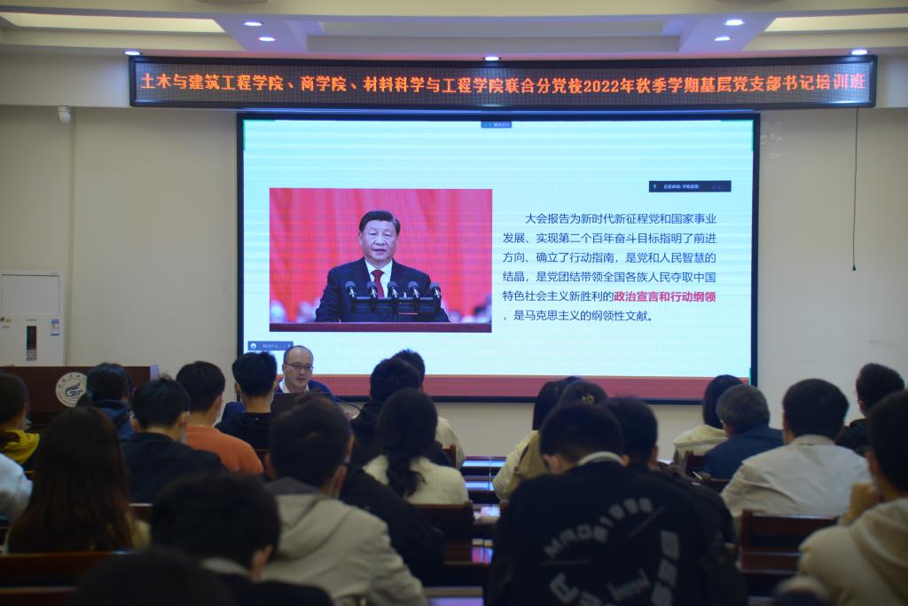 为深入学习宣传贯彻习近平新时代中国特色社会主义思想和党的二十大精神,全面提升党支部组织力和党支部书记的履职能力,强化党支部政治功能,充分发挥党支部战斗堡垒作用和党员的先锋模范作用。11月15日晚,土木与建筑工程学院、商学院、材料科学与工程学院联合分党校2022年秋季学期基层党支部书记培训班在4204会议室进行。学校马克思主义学院副院长蒋晓俊同志讲题为《学习贯彻党的二十大精神,以中国式现代化全面推进中华民族伟大复兴》专题党课。屏风校区三个学院所属党支部支委及师生党员代表参会。