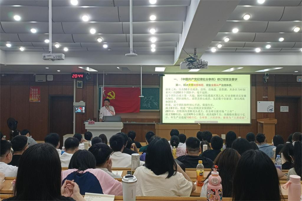 为深入学习贯彻习近平总书记关于党纪学习教育的重要讲话和重要指示精神,认真学习新修订的《中国共产党纪律处分条例》,强化师生党员的纪律意识、提高党性修养,做到学纪、知纪、明纪、守纪。5月12日晚,学校马克思主义学院杨公银同志在屏风校区9401教室为学院师生党员讲党纪学习教育专题党课。