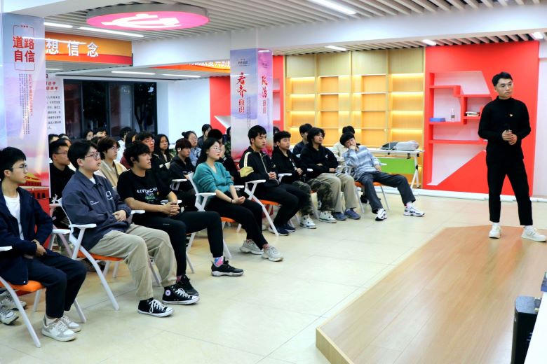 继而黄杰同志借助2023欢庆流行榜《尼的呀》音乐视频,将一首经典但又颇具现代色彩的广西民歌展现给了大家。在黄杰同志的带领下,同学们表现出对广西民歌的浓厚兴趣,并在唐丹婷老师的指导下,同学们积极学习广西传统民歌的韵律,并在学习之后体验了山歌创编,山哥对唱的环节,现场气氛热闹非凡。