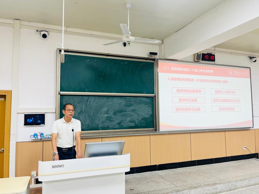 为深入学习贯彻习近平新时代中国特色社会主义思想,认真落实党的二十大和党的二十届一中、二中、三中全会精神。9月6日下午,学院党委书记梁军在9201教室为学院教职工讲授题为《深刻领会学习党的二十届三中全会精神》专题党课,学院全体教职工参加学习。