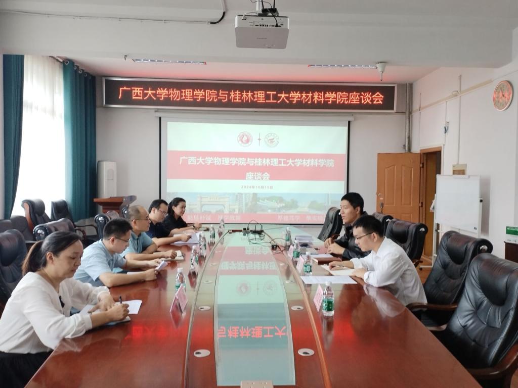 郝文佳介绍了学院党委的工作概况,并就学院怎样实现高质量党建引领高质量发展以及所取得成效进行了详细说明。围绕着《蓝图已绘就,奋进正当时——学院四年行动计划实施方案(2024-2027)》,郝文佳具体介绍了学院党建工作的思路与做法。张瑞从师资队伍、科研平台、社会服务等方面进行了讲解,分享了学院近年来取得的学术成果和各科研团队的研究情况。陆翔载座谈会上详细介绍了广西大学物理学院在人才培养、科学研究、社会服务等方面的主要做法。双方座谈人员围绕高质量党建引领学院高质量发展、标杆院系建设、样板支部建设等方面进行交流。