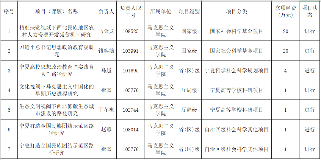 宁夏大学2017年度科研成果【纵向科研项目】统计表(社科类) 1