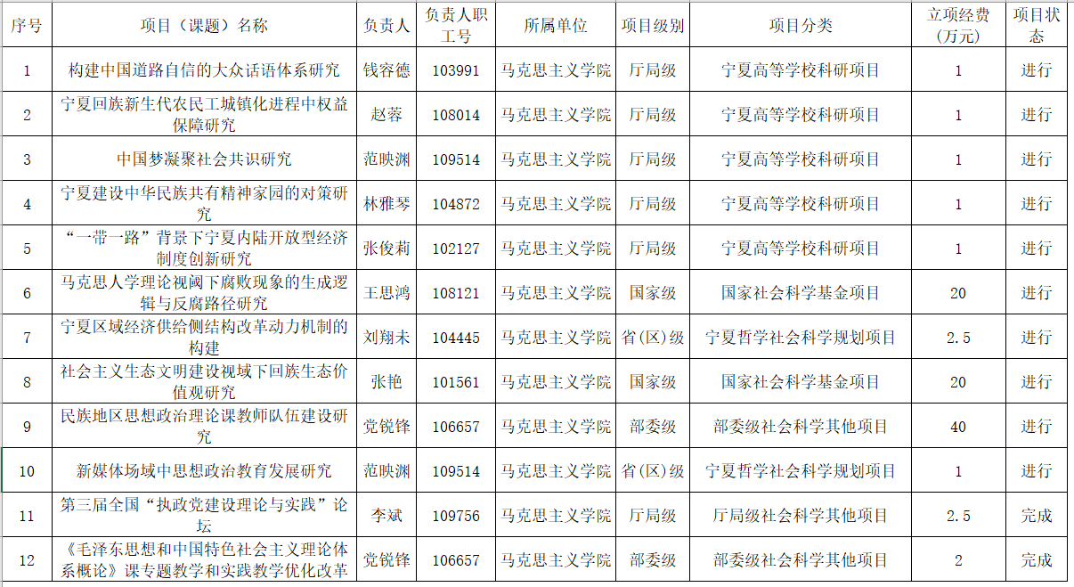 宁夏大学2016年度科研成果【纵向科研项目】统计表(社科类) 1