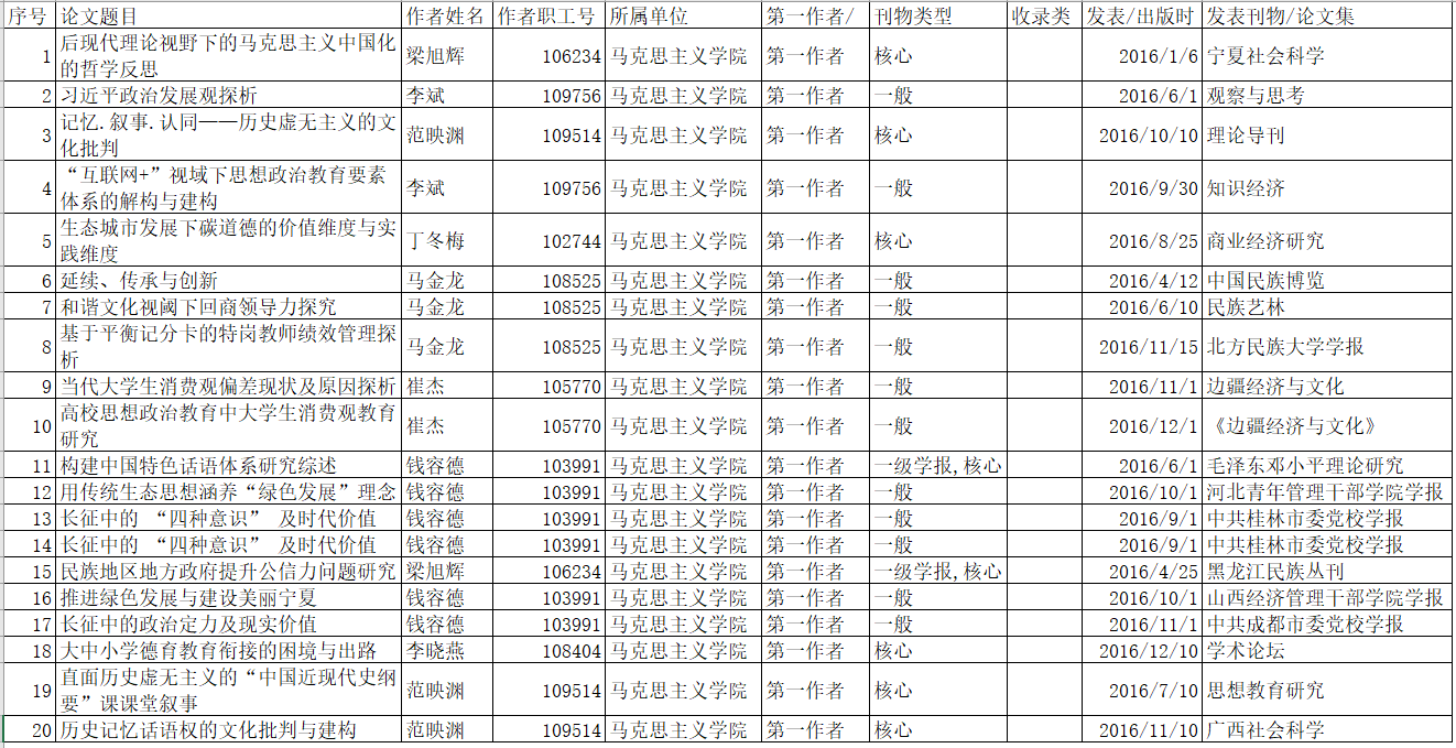 宁夏大学2016年度科研成果【学术论文】统计表(社科类)