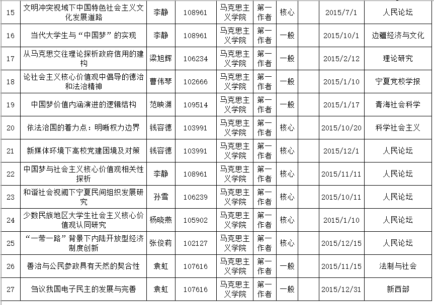 宁夏大学2015年度科研成果【学术论文】统计表(社科类) 2
