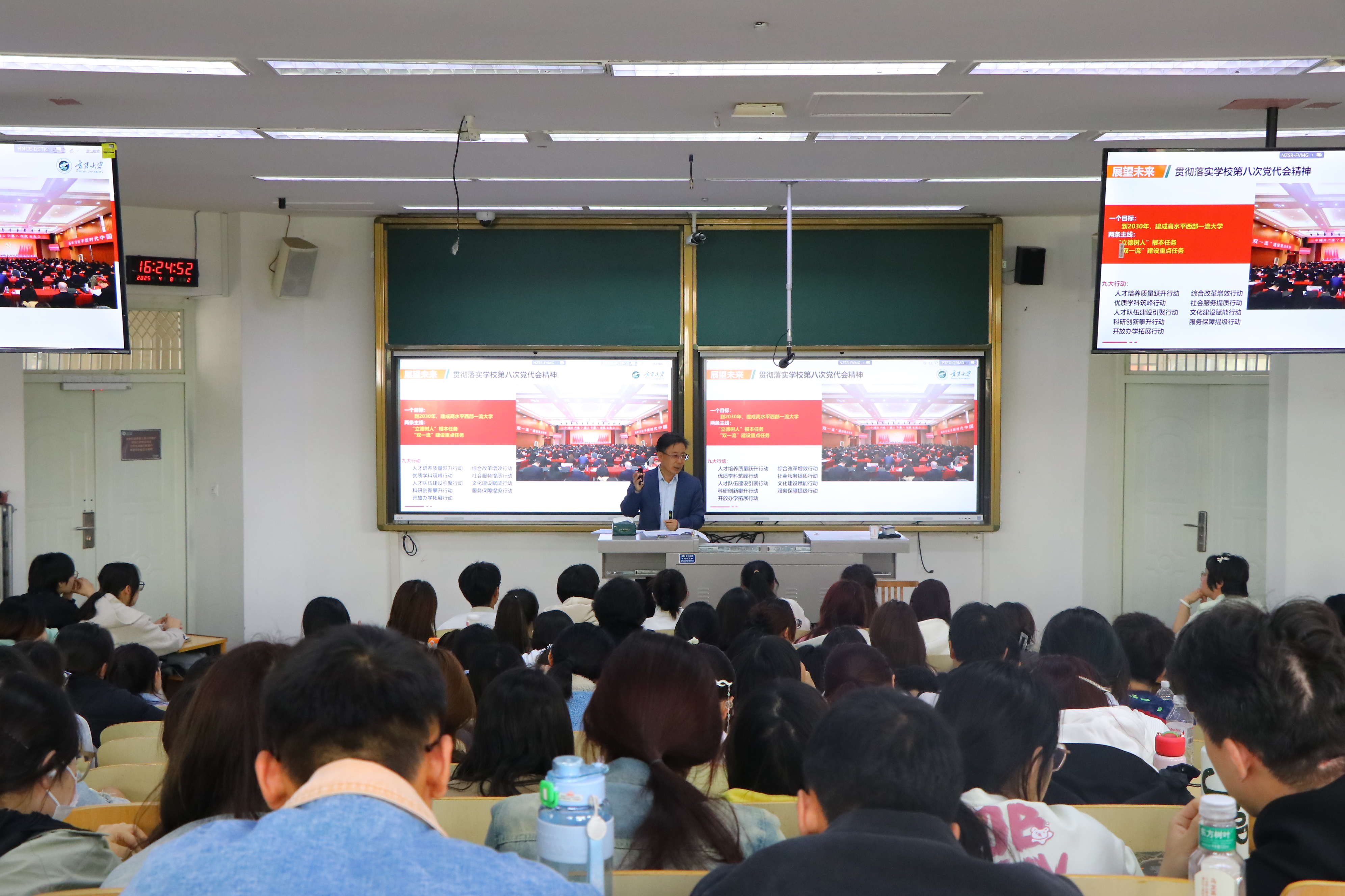 【宁夏大学新闻中心讯 冯禹君/文 学生记者宋丽群/图】为进一步贯彻落实习近平总书记关于学校思政课建设的重要指示精神,全面落实立德树人根本任务,充分发挥学校领导干部在思想政治教育主渠道中的引领示范作用,4月7日至8日,校党委书记李星,校党委副书记、校长彭志科分别为法学院、化学化工学院2024级本科生讲授“从教育大国迈向教育强国”专题形势与政策课。