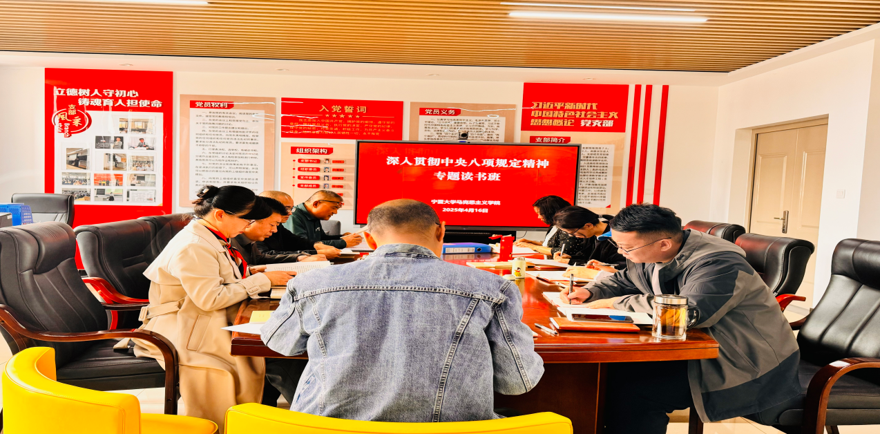 为深入学习贯彻习近平总书记关于党的作风建设重要论述,持续推进中央八项规定及其实施细则精神落地落实,4月16日,宁夏大学马克思主义学院党总支举办深入贯彻中央八项规定精神学习教育读书班(第一期),推动作风建设学习教育走深走实。学院党总支委员、领导班子成员、各党支部书记参加此次读书班活动。