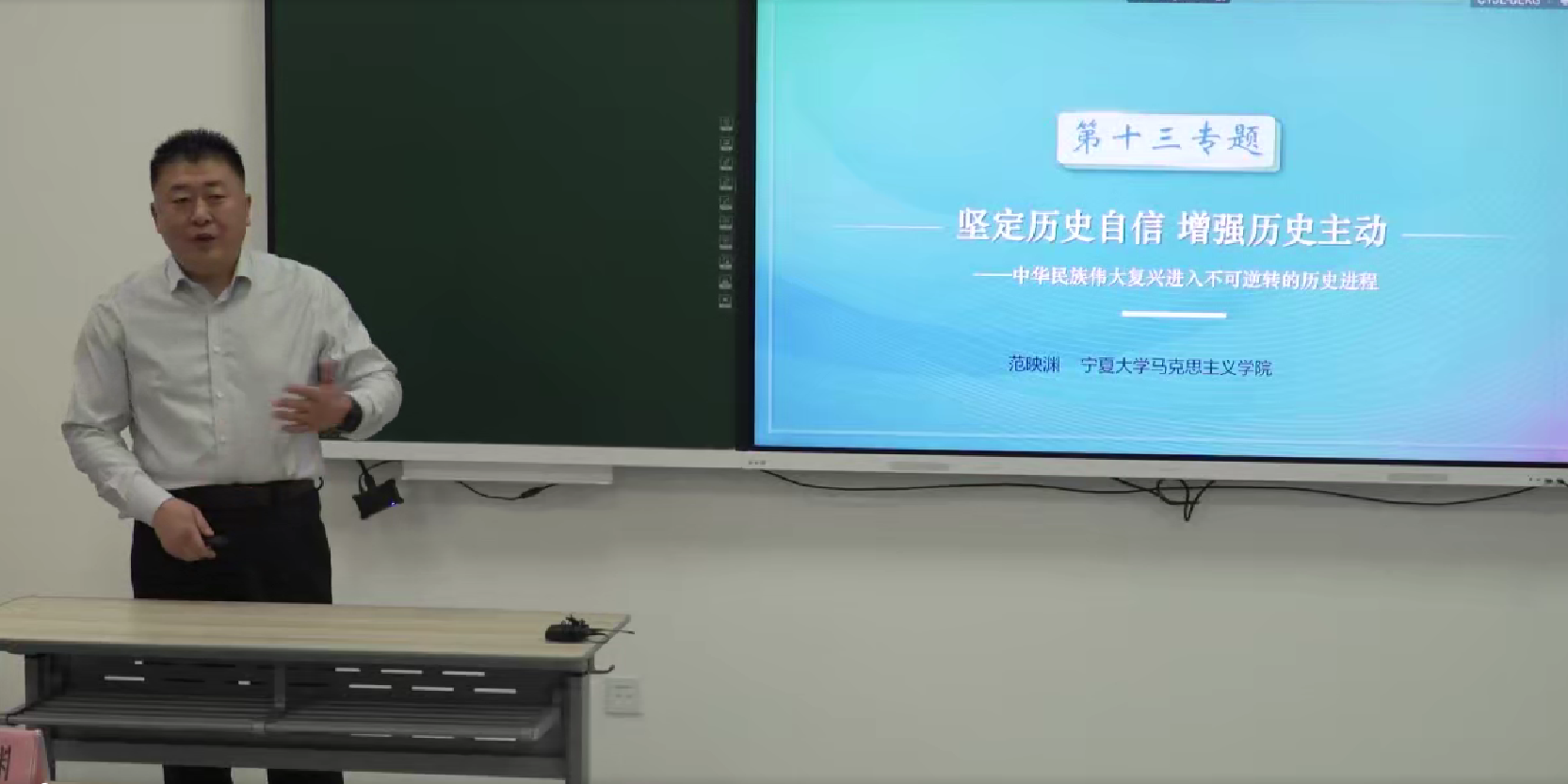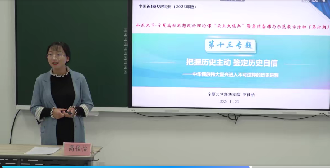 活动期间,教育部高校思想政治理论课教学指导委员会“中国近现代史纲要”分教指委委员、《把握历史主动 坚定历史自信》专题课件的制作人、宁夏大学马克思主义学院院长范映渊教授结合自身的经验和认识,从专题地位、教学目标、重难点把握、教学中应注意的问题等方面,做了深入浅出的理论阐释。山东大学马克思主义学院教师靳贺、宁夏大学马克思主义学院教师徐静、宁夏大学新华学院马克思主义学院教师高佳怡分别以问题讲解、说课等形式,通过教学思路及教学设计、学情分析、教学方法、教学案例等方面,进行了精彩的教学展示,充分展现了青年思政课教师扎实的理论功底和娴熟的教学技能。
