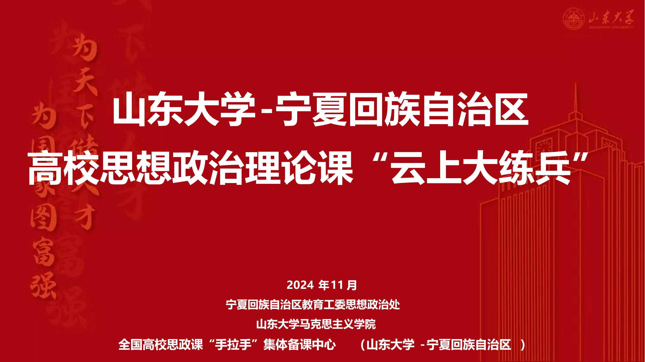 11月23日上午,由全国高校思政课“手拉手”集体备课中心(山东大学-宁夏回族自治区)、自治区教育工委思想政治处主办、山东大学马克思主义学院、宁夏大学马克思主义学院承办的山东大学-宁夏高校思想政治理论课“云上大练兵”暨集体备课与示范教学活动在我校贺兰山校区举行。宁夏中国近现代史纲要课程委员会委员、各高校承担“中国近现代史纲要”课程教师,山东大学马克思主义学院部分教师参加了此次活动。活动由中国近现代史纲要课程委员会秘书长祁莉霞主持。
