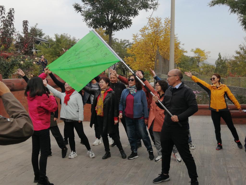 本次秋游活动一共分为两个阶段:第一阶段是以“放松自我、团结协作”为主题的团队素质拓展活动。全体教职工在专业拓展教练的指挥下,迅速整装列队,开始了“教练说”团队一致性素质训练活动。紧接着,在响亮的口号和活跃的氛围中,开始了团队协作能力对抗训练。全体教职工分别进行了队名、队歌、团队logo、队旗等的设计比拼。“北斗队”、“飞翔队”以及“超越队”三支队伍在队长指挥下依次斗志昂扬的出场展示,将活动气氛推向高潮。