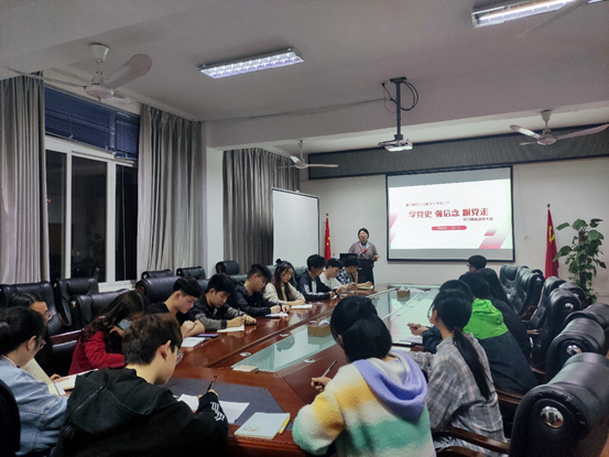 会议伊始,赵思聪老师给各学生组织代表明确了学习党史的三大重要意义,随后从党史的重要作用、党史给我们的三大启示及新时代对党员干部的要求三个方面,带领全体与会人员共同学习习近平总书记在党史动员大会上的重要讲话精神。