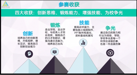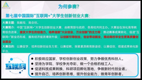 本次直播共分为两个议程。首先,主讲人简要介绍中国国际“互联网+”大学生创新创业大赛,提升大家对“互联网+”的认识。接着,由各取得优异成绩的项目的团队代表分享参赛经验与心得。团队代表分享了为何参赛、如何参赛、给出了参赛建议以及参赛收获,并着重分享了如何参赛及前期的准备。