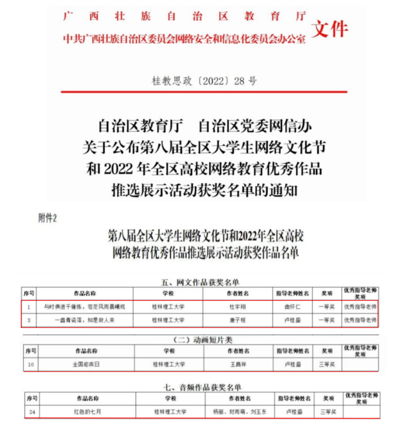 近日,由自治区教育厅会同自治区党委网信办组织开展的第八届全区大学生网络文化节和2022年全区高校网络教育优秀作品推选展示活动评选结果揭晓,我院师生荣获多项奖项。其中,杜宇翔同学的作品《与时俱进千锤炼,苍茫风雨晨曦现》获网文作品类一等奖,指导老师曲怀仁获优秀指导老师;唐子桓同学的作品《一盏青瓷落,知是故人来》获网文作品类一等奖,指导老师卢桂盛获优秀指导老师;王昌祥同学的作品《全国疟疾日》获动画短片类三等奖;杨丽、封雨萌、刘玉东同学的作品《红色的七月》获音频作品类三等奖。