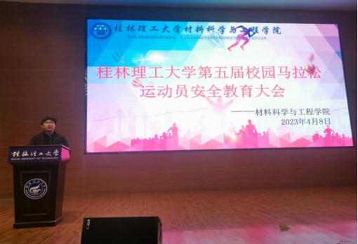桂林理工大学第五届校园马拉松赛于4月9日在雁山校区进行,为确保本次赛事顺利进行,材料科学与工程学院于4月8日下午在屏风图书馆报告厅召开马拉松运动员安全教育大会,学院团委副书记卢桂盛、屏风校区运动员参加此次会议。