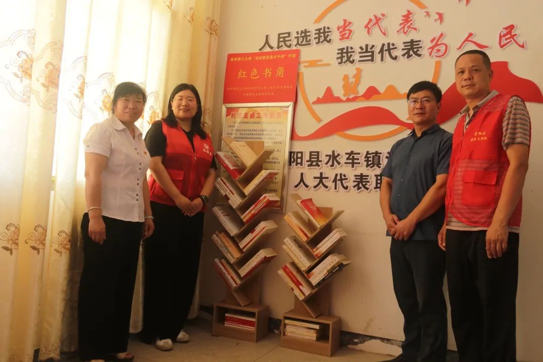 水车镇副镇长蒋喜祥、江塘村支书盘月秀、驻村第一书记袁小军等热烈欢迎实践团的到来,并与实践团成员们开展了座谈。随后,研究生第二党支部副书记赵思聪老师和蒋喜祥副镇长等共同为支部捐赠的“红色书角”揭牌;赵老师代表研究生第二党支部向村委会赠送慰问品;为进一步加强交流合作,促进各项帮扶工作落到实处,实践团代表学院与江塘村举行大学生社会实践和志愿服务基地挂牌仪式。