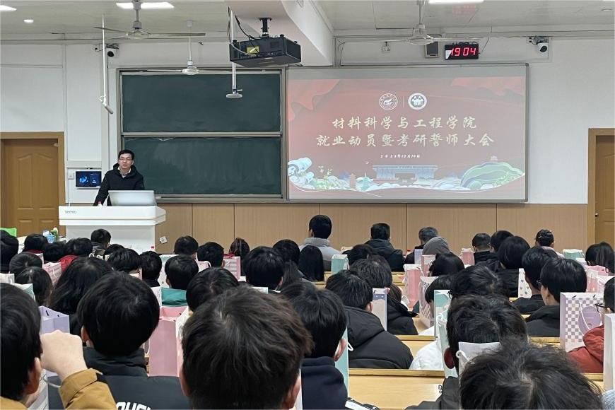 为助力2024届毕业生顺利就业,帮助毕业生提升就业能力,树立正确的就业观和择业观,缓解备考压力,坚定考研信心。2023年12月19日晚,材料科学与工程学院2024届就业动员暨考研誓师大会在屏风校区9301教室顺利举行。学院党委副书记郝文佳、学院副院长张瑞、各教研室代表老师、各班班主任、2024届全体学生参加会议。本次大会由2020级辅导员曲怀仁老师主持。