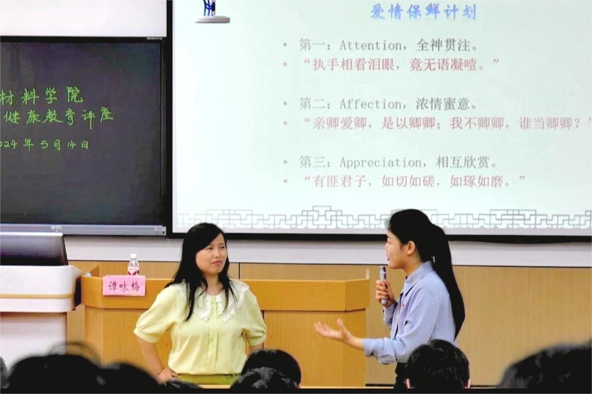 为树立大学生积极和谐的恋爱观念,培养良好的恋爱心态,掌握恰当处理恋爱困扰的方式方法,提升责任与担当意识,5月14日下午,材料科学与工程学院在屏风校区9113举办了“典籍里的爱情——中华优秀传统文化中的爱情密码”主题讲座。本次讲座由学校心理健康教育与咨询中心专职教师、“咏梅”工作室负责人谭咏梅老师主讲,学院辅导员唐丹婷老师主持。