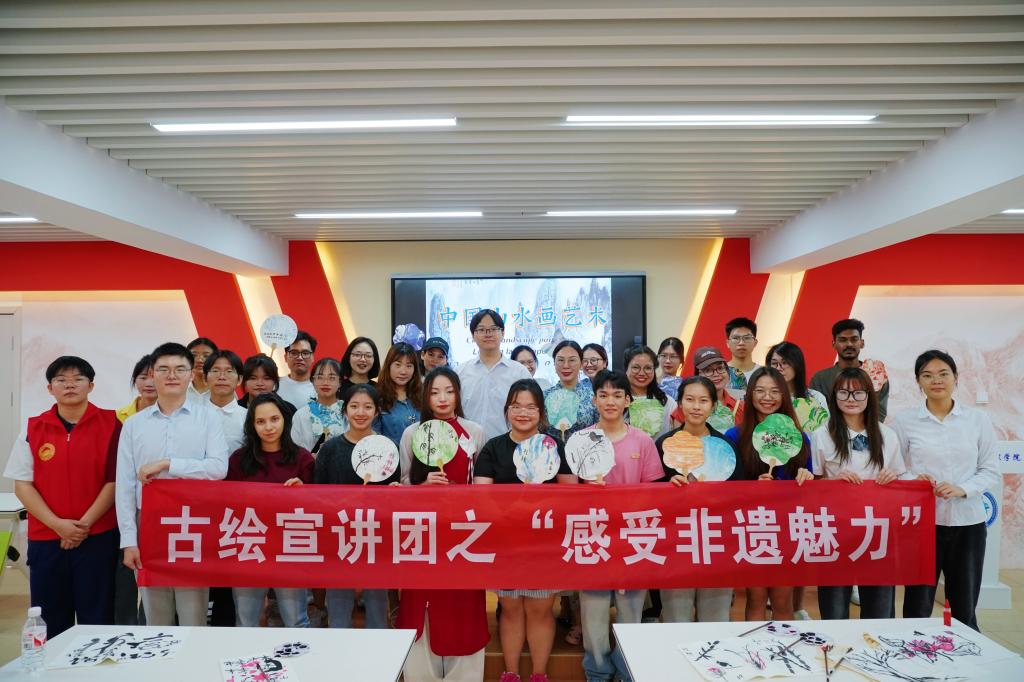 古绘宣讲团讲解员赵晨健同学首先围绕中国山水画的历史背景、艺术特点和形式美感等方面对中国山水画的悠久历史和深厚底蕴进行了生动讲解,使在场师生对中国画的艺术特色有了更加直观的认识。随后,讲解员通过现场演示,从形神、笔墨、色彩和形制四个方面详细解析了中国山水画的精髓,让同学们对中国山水画的艺术语言和审美价值有了更深层次的理解。随后,现场的留学生们在老师的指导下动手尝试毛笔书写与绘画,从简单的线条练习到构图创作,体验了中国书法的韵味与绘画的乐趣。漆扇制作环节将活动推向了高潮,留学生们争先参与漆扇制作,绘制属于自己的漆扇,在扇面写下期望与祝福。师生们纷纷表示,这是一次令人难忘的文化体验活动,让他们切实感受到了中国传统工艺的精湛技艺与细腻匠心,使他们对中华文化有了更加深刻的理解和感悟,希望未来能有更多这样的文化交流机会,增进对中华文化的了解和认同。