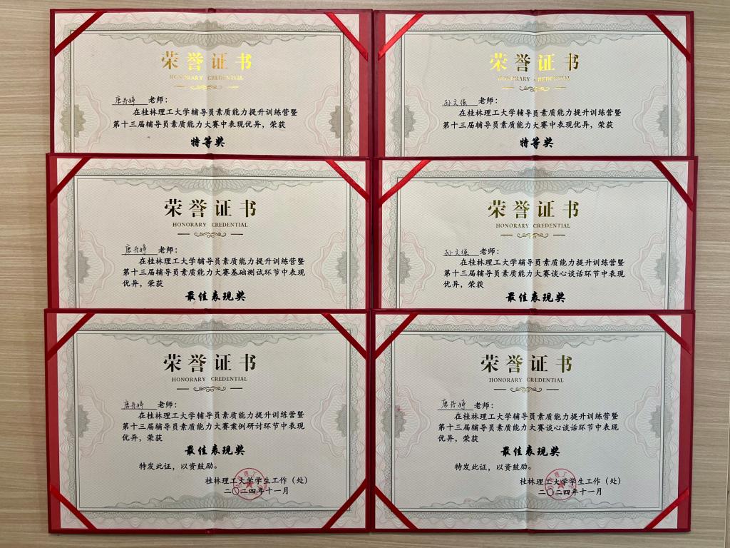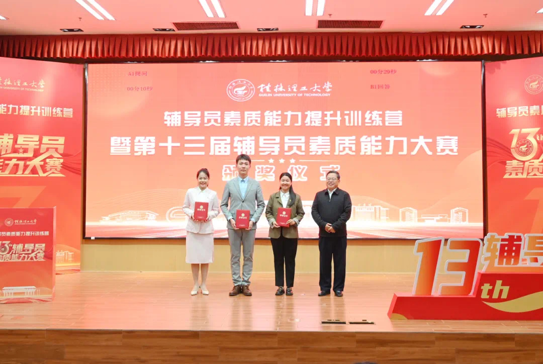 11月21日,学校辅导员素质能力提升训练营暨第十三届辅导员素质能力大赛决赛在雁山校区图书馆报告厅落下帷幕。本次比赛在桂林校区、南宁分校两校区同步开展,共有32名选手晋级决赛,并最终共评出特等奖3名、一等奖6名、二等奖10名、三等奖13名、最佳表现奖8项。经过激烈角逐,我院学工队伍在此次比赛中取得好成绩,2022级辅导员唐丹婷获特等奖、三个环节均获最佳表现奖;2023级辅导员孙文强获特等奖、在谈心谈话环节获最佳表现奖! 据悉,本届大赛分为基础知识测试、谈心谈话、案例研讨三个环节,从基础理论和实务应用等方面出发,全面考察辅导员们的政治素养、业务能力、工作作风。我院辅导员高度重视、认真筹备,赛场上,两位老师沉着应战,出色表现,充分展示工作技能、交流先进经验、传递价值认同、展示个人风采,完美展现了学院学工队伍昂扬向上的精神面貌和过硬的素质能力。 今后,学院也将继续推进辅导员队伍建设,用好学校搭建的各项工作平台,坚持以赛代练、以赛代训,切实增强学院辅导员队伍的专业化职业化水平,让学工队伍成为推动学院高质量发展的有生力量,培养更多堪当民族复兴重任的时代新人。 学校党委副书记吴志强为我院辅导员唐丹婷、孙文强颁发特等奖 我院辅导员合计获得特等奖2项、最佳表现奖4项 (一审:孙文强 二审:赵思聪 三审:郝文佳)