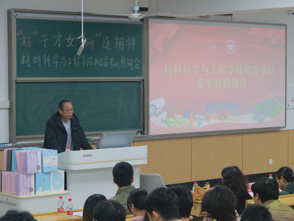 学院党委书记梁军代表学院党委为考研学子送上了诚挚的祝福。并以“三心”为关键词勉励大家:第一是信心,桂工材料人始终有实力、有口碑,未来的工作与发展都充满竞争力,希望同学们相信自己的能力,充满信心迎接挑战。第二是恒心,一路走来,坚持到今天已是成功的重要一步,在最后的时间里更要咬紧牙关,坚定不移地完成考试;第三是细心,考前做好每一个细节检查,明确考场路线,确保准时到达,为考试发挥提供最佳状态。