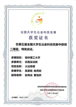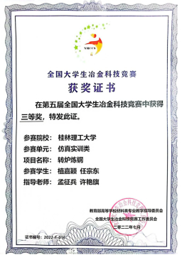在我院冶金与金属材料工程教研室老师的精心指导下,代表桂林理工大学参赛共6项作品闯入决赛,经集中会评和终评答辩,最终科技创新竞赛单元获得二等奖2项,三等奖4项,仿真实训类的四支队伍全部获奖,其中转炉炼铜分别荣获大赛的一等奖、二等奖各一项,转炉炼钢荣获二等奖、三等奖各一项,为桂林理工大学争得了荣誉。体现了材料学院学子的综合素质和技能水平,也是对学院、学校办学特色和办学优势的最好诠释。