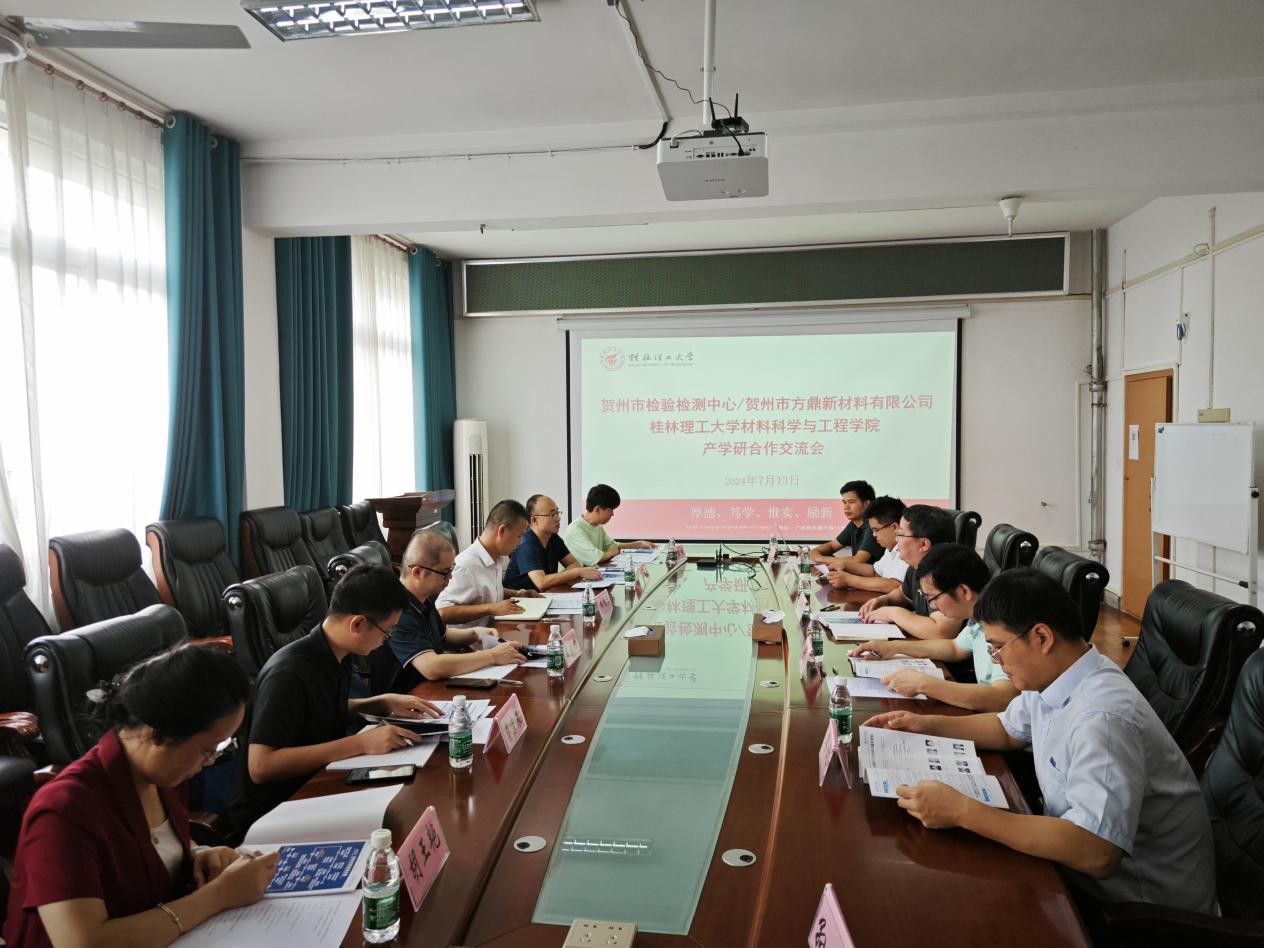 贺州市检验检测中心及贺州市方鼎新材料有限公司赴我院调研交流7月13日,贺州市检验检测中心党组成员、副主任韦福广一行及贺州市方鼎新材料有限公司黄国栋董事长一行联合到我院进行交流调研。我院院长周焕福热情接待了来访客人并主持了座谈交流会。教育部重点实验室副主任(主持工作)刘远立、副院长张瑞、学院相关教研室负责人及教师参加了座谈交流。周焕福代表学院对韦福广、黄国栋等的访问交流表示了热烈欢迎,并简要介绍了学院科教团队、教学科研平台等的基本情况,表达了希望与贺州市检...2024-07-15